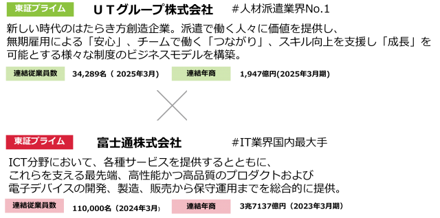 日本で一番大きな人材派遣会社UTグループ と ICT業界のトップを走る富士通グループ が融合して生まれた会社です。